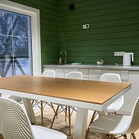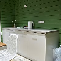 Комната отдыха оснащена: панорамные окна, обеденный стол, стулья, диван, кухонный гарнитур, встроенный холодильник (объемом 133л), микроволновая печь, средство для мытья посуды, губка для мытья посуды, кухонные полотенца, чайник, чайные пары, тарелки плоские, тарелки глубокие, столовые приборы, салатник, разделочная доска, разделочный нож, вода бутилированная (20 литров), чай, сахар, кофе 3в1.