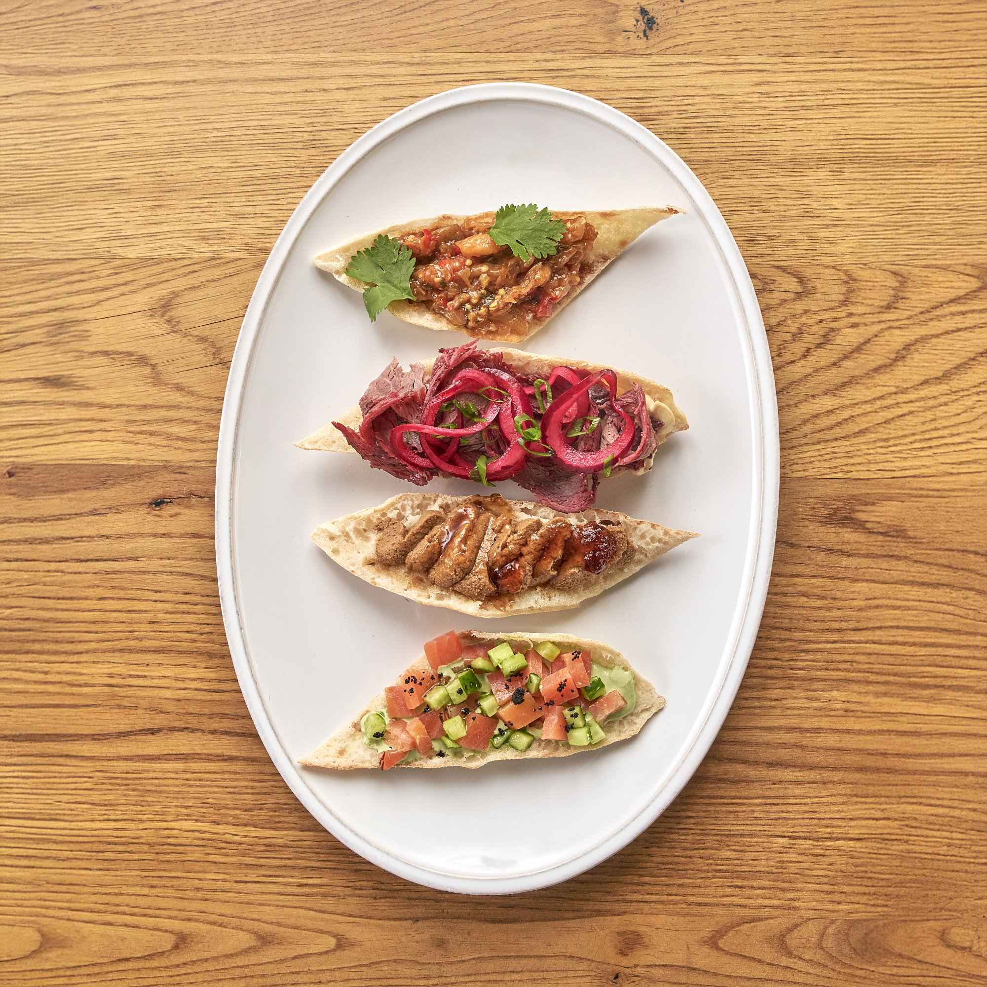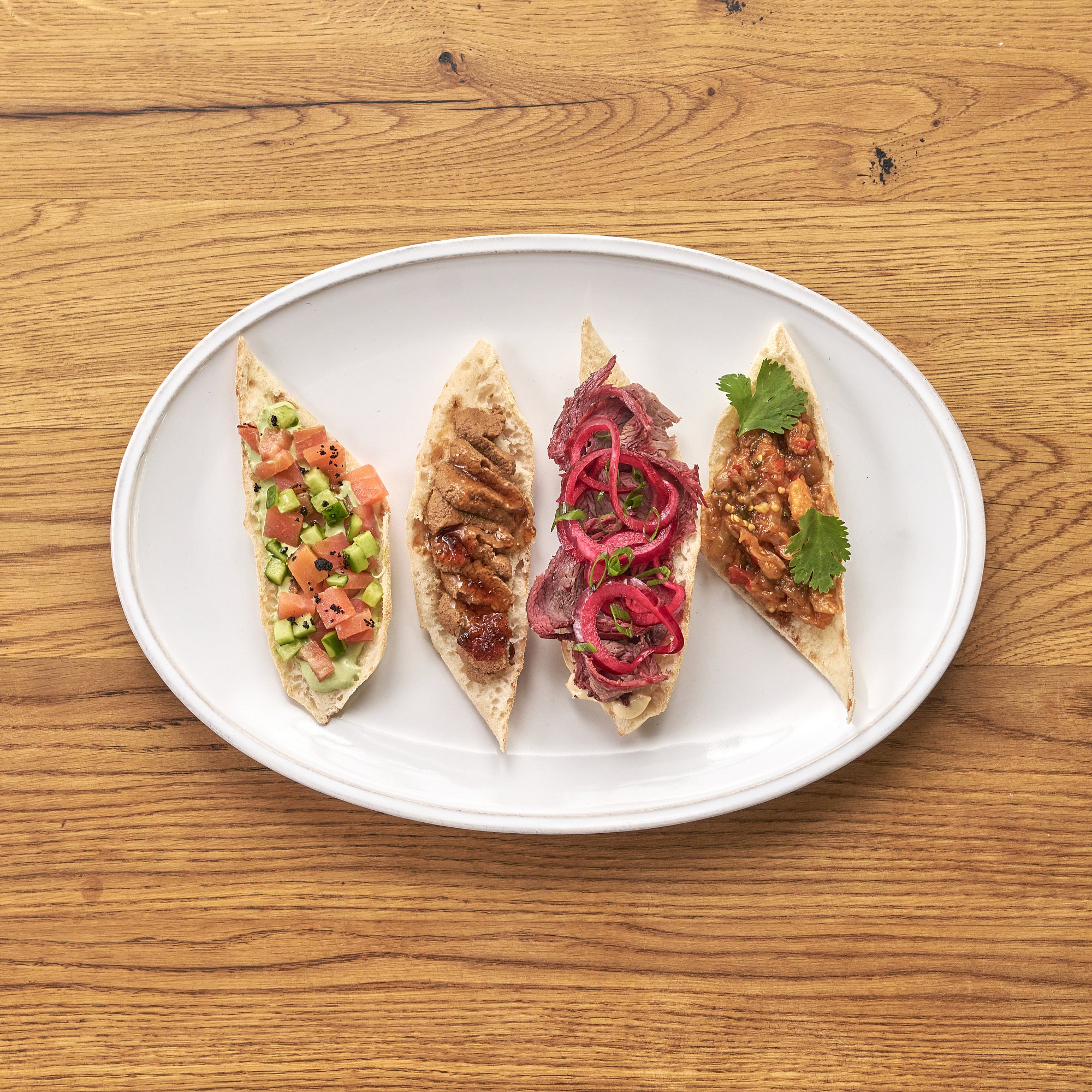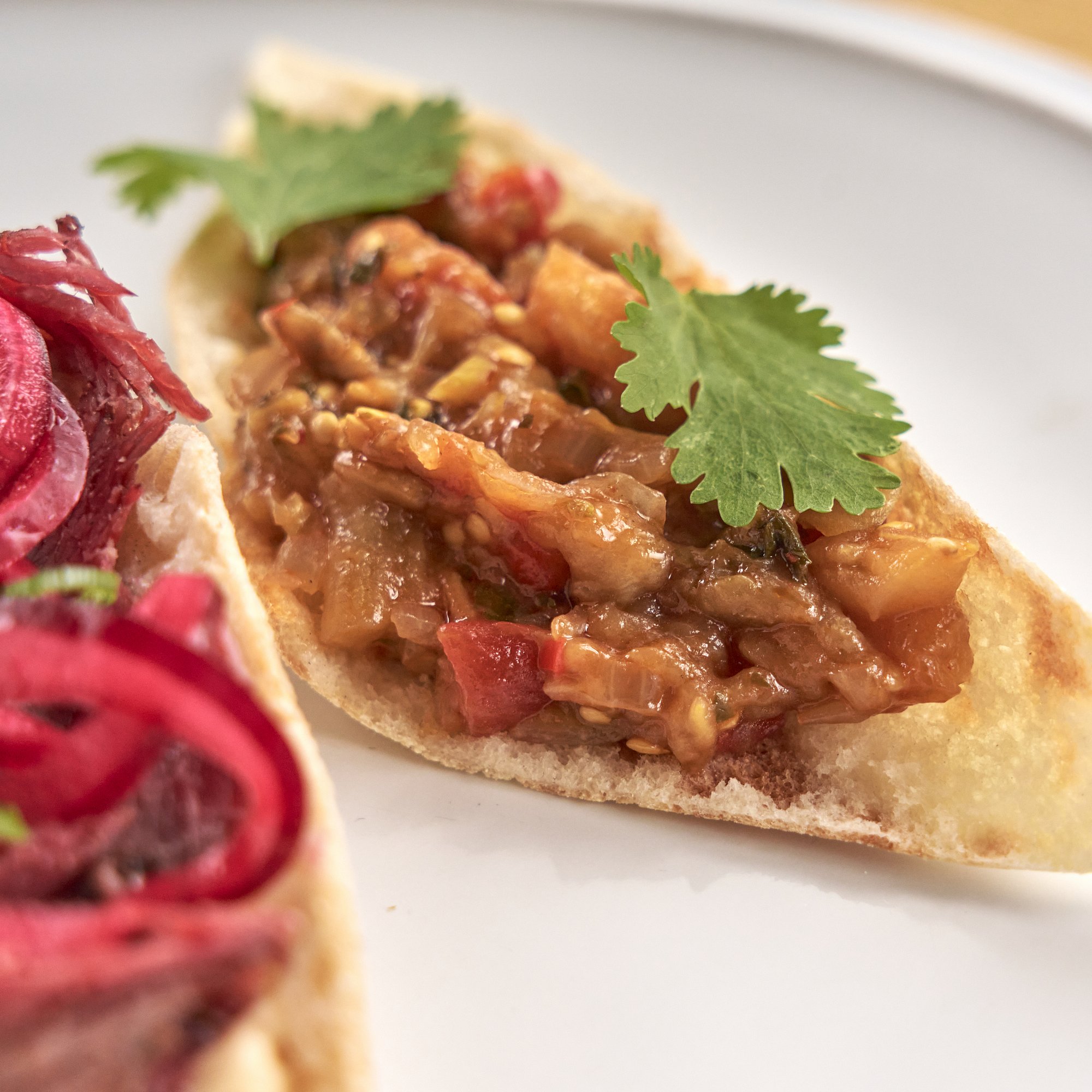 Брускетта с запечённым баклажаном, томленым вместе с луком, сельдереем и болгарским перцем в густой томатной основе. Подаётся со свежей кинзой для лёгкости и аромата.