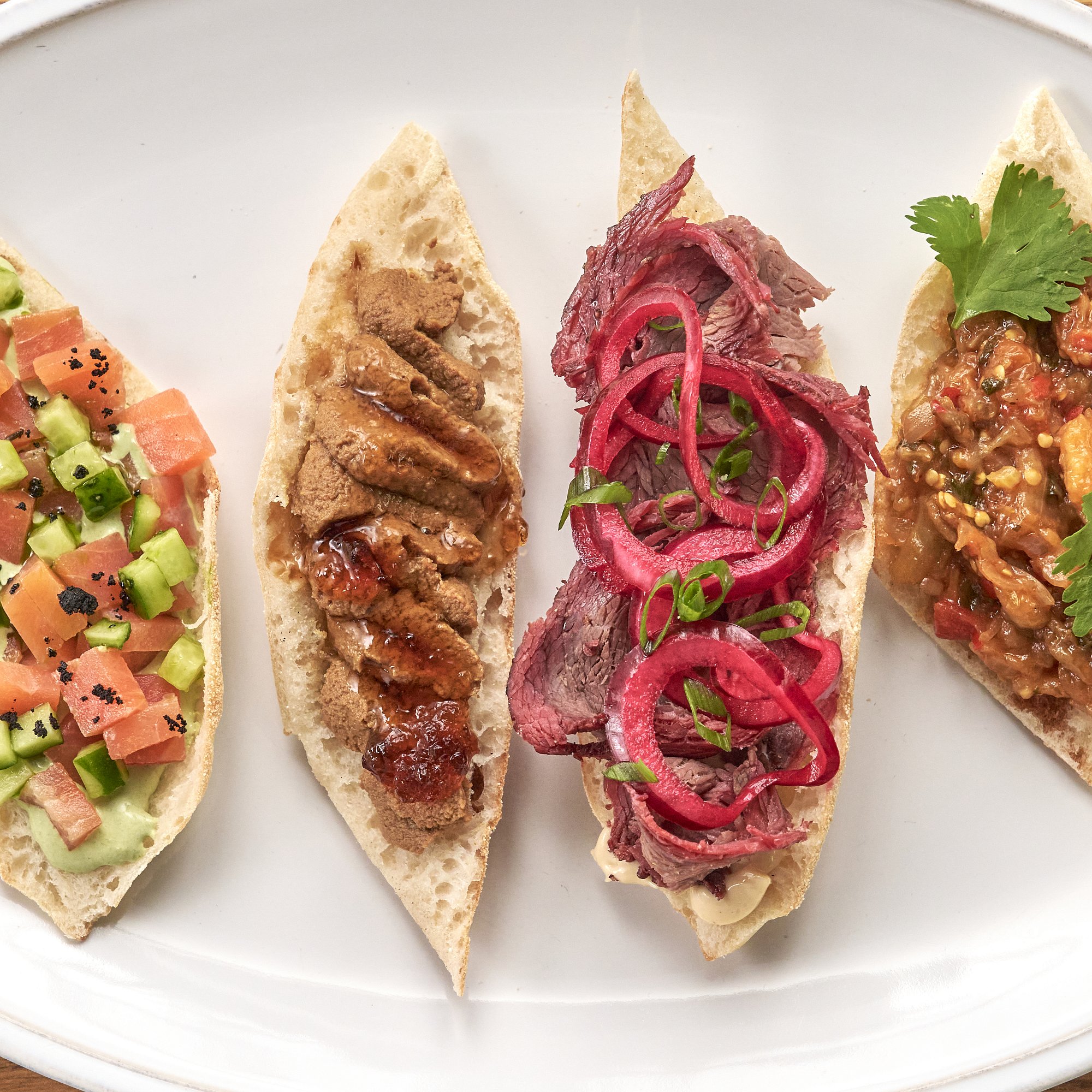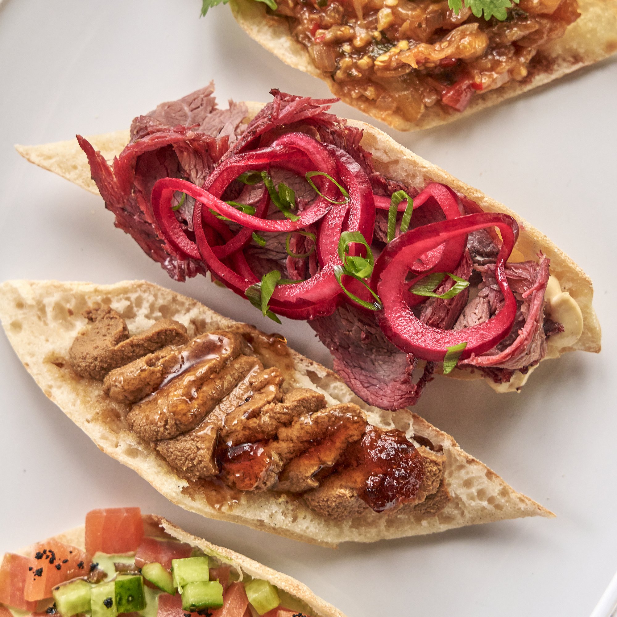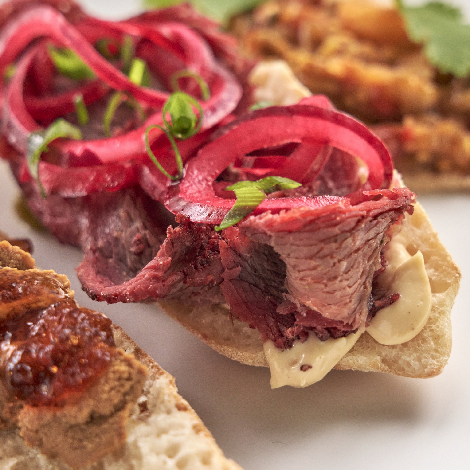 Брускетта с нежнейшим копченым ростбифом, соусом Цезарь и изысканной соево-медовой заправкой с нотками горчицы, которая подчеркивает вкус мяса. Украшено зеленым луком.
