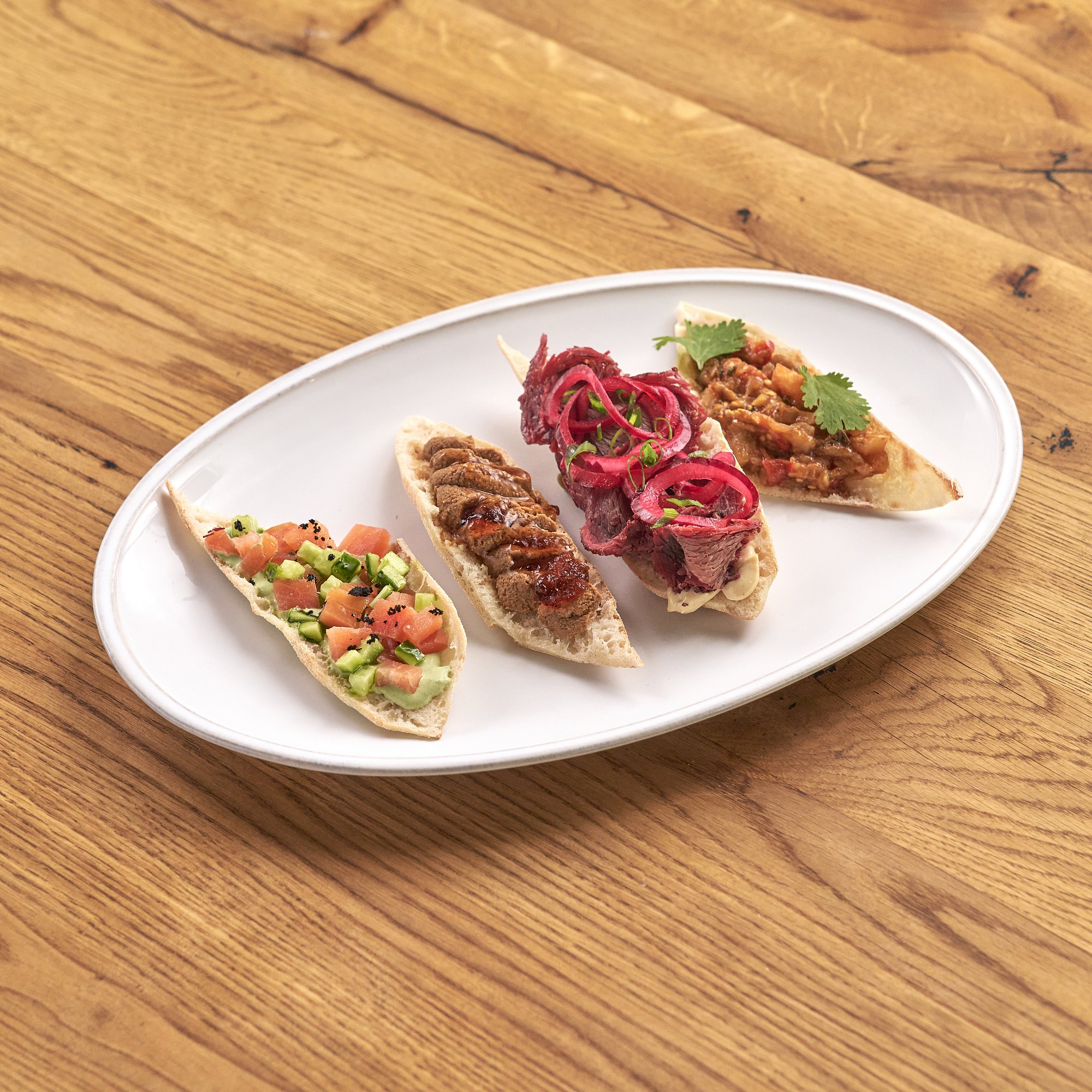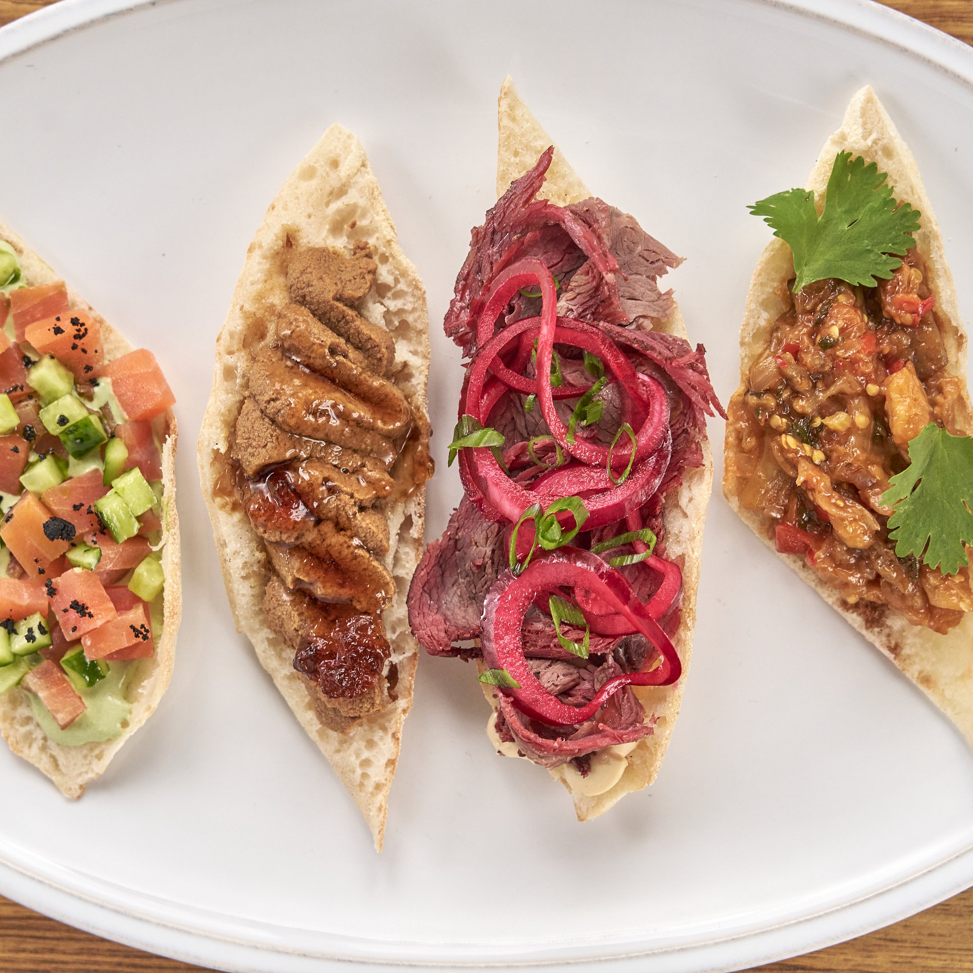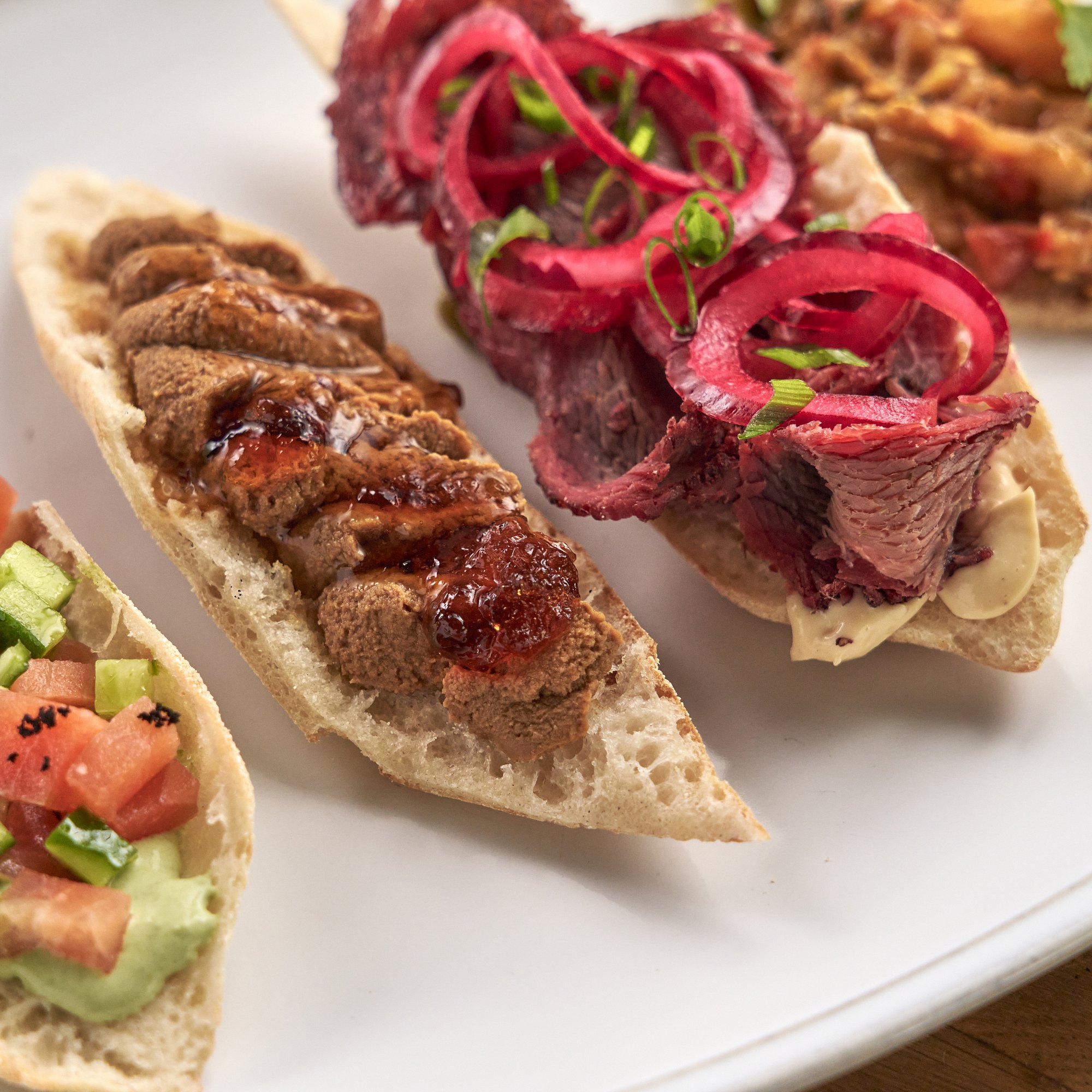 Брускетта с нежнейшим копченым ростбифом, соусом Цезарь и изысканной соево-медовой заправкой с нотками горчицы, которая подчеркивает вкус мяса. Украшено зеленым луком.