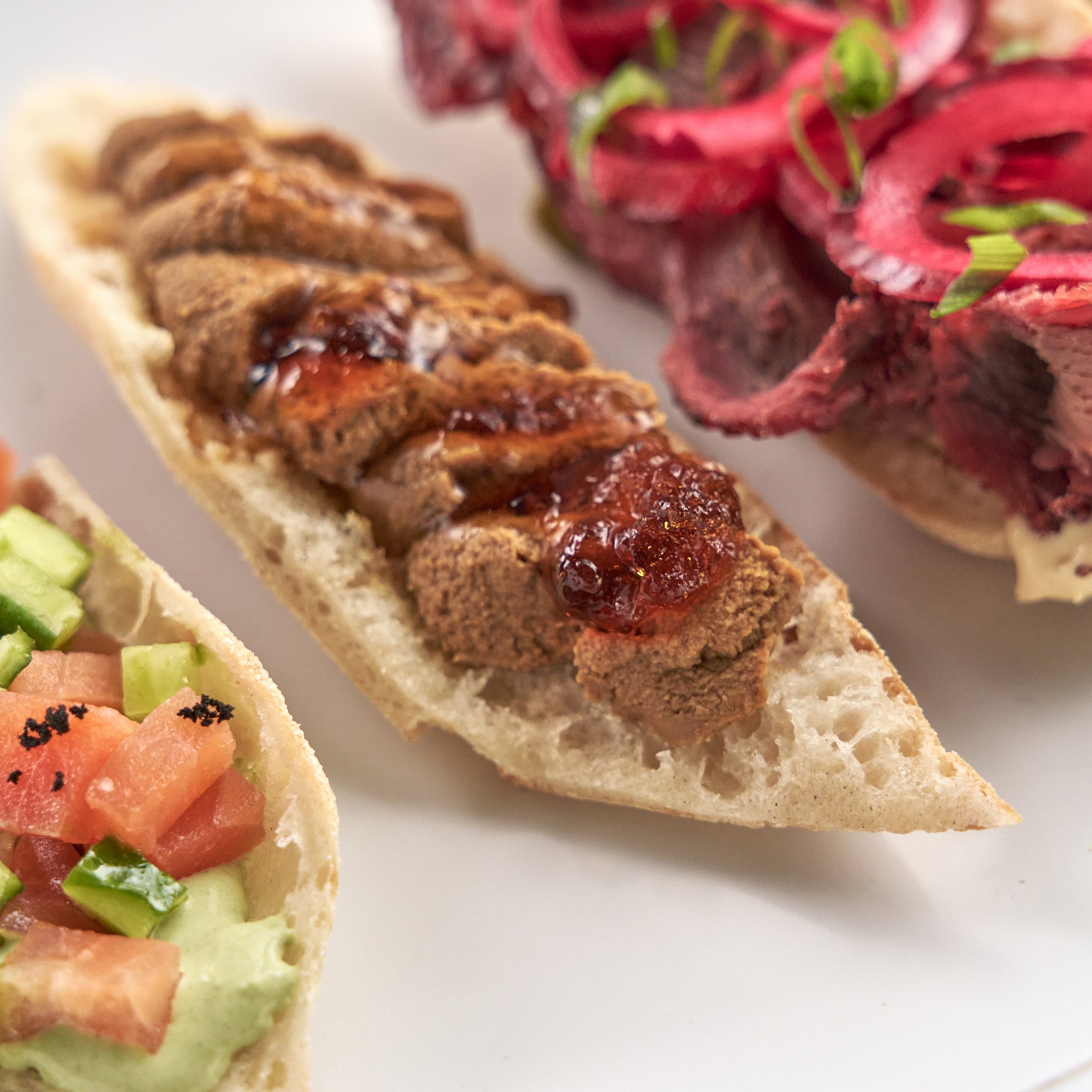 Брускетта с воздушным, тающим паштетом из печени, сердца и легкого поросенка. Готовится на сливках с травами и мускатным орехом для идеальной кремовой текстуры. В комплекте — пикантный конфитюр из красного лука на квасе, который подчеркивает вкус паштета.