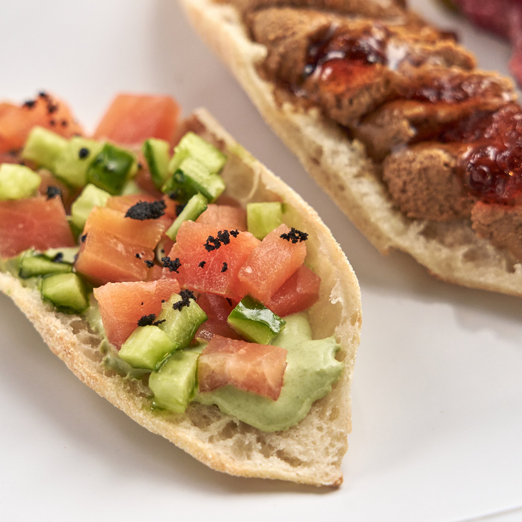 Брускетта со слабосоленым лососем и творожно-травяным муссом с добавлением трав и свежих огурцов.