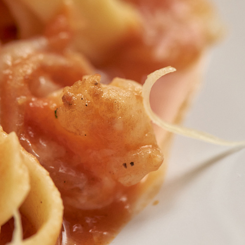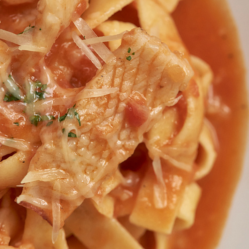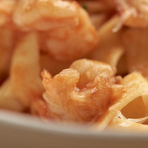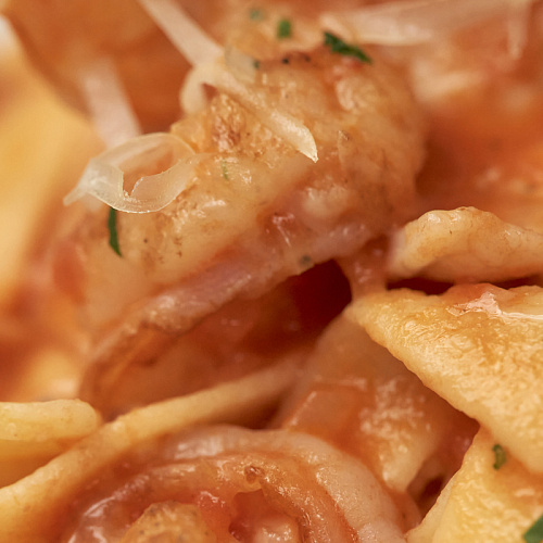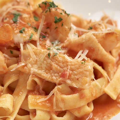 Морепродукты (кальмар и тигровые креветки) обжариваются с чесноком и вином, после добавляется томатный соус (томаты в собственном соку, лук репчатый, чеснок, соль, перец, сахар) и паста феттучини fresca; блюдо посыпается тёртым пармезаном.