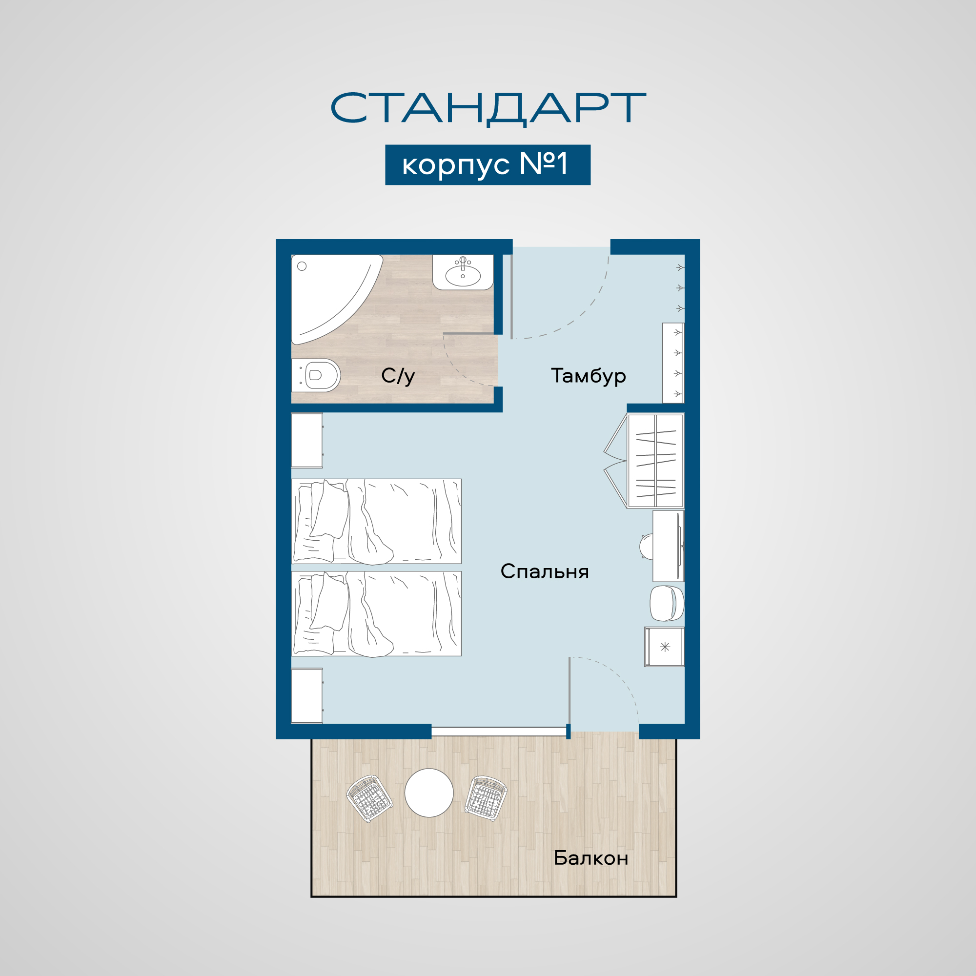 2 кровати «Сомье», 2 тумбочки, платяной шкаф, письменный стол, стул, зеркало, ковровое покрытие, кондиционер, телевизор, мини-холодильник, электрический чайник, чайная станция (чайные пары, чай пакетированный, сахар), вода бутилированная; санузел с душевой кабиной, фен, гель для душа, шампунь, зубной набор, тапочки; балкон с двумя стульями и столиком, вид на протоку.