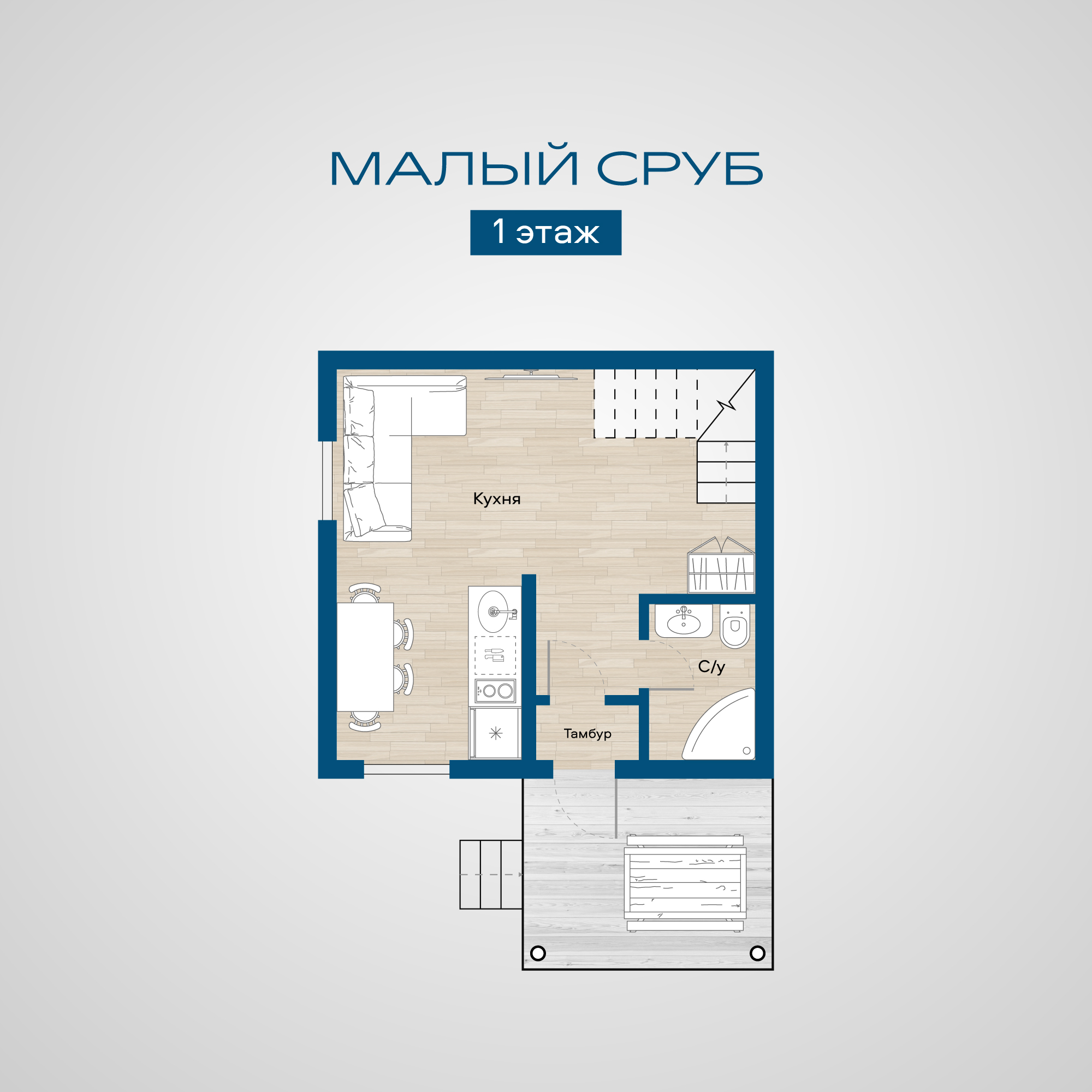 Двухэтажный срубовой коттедж. Перед входом располагается площадка для барбекю. Также предусмотрена веранда со столом и лавочками.