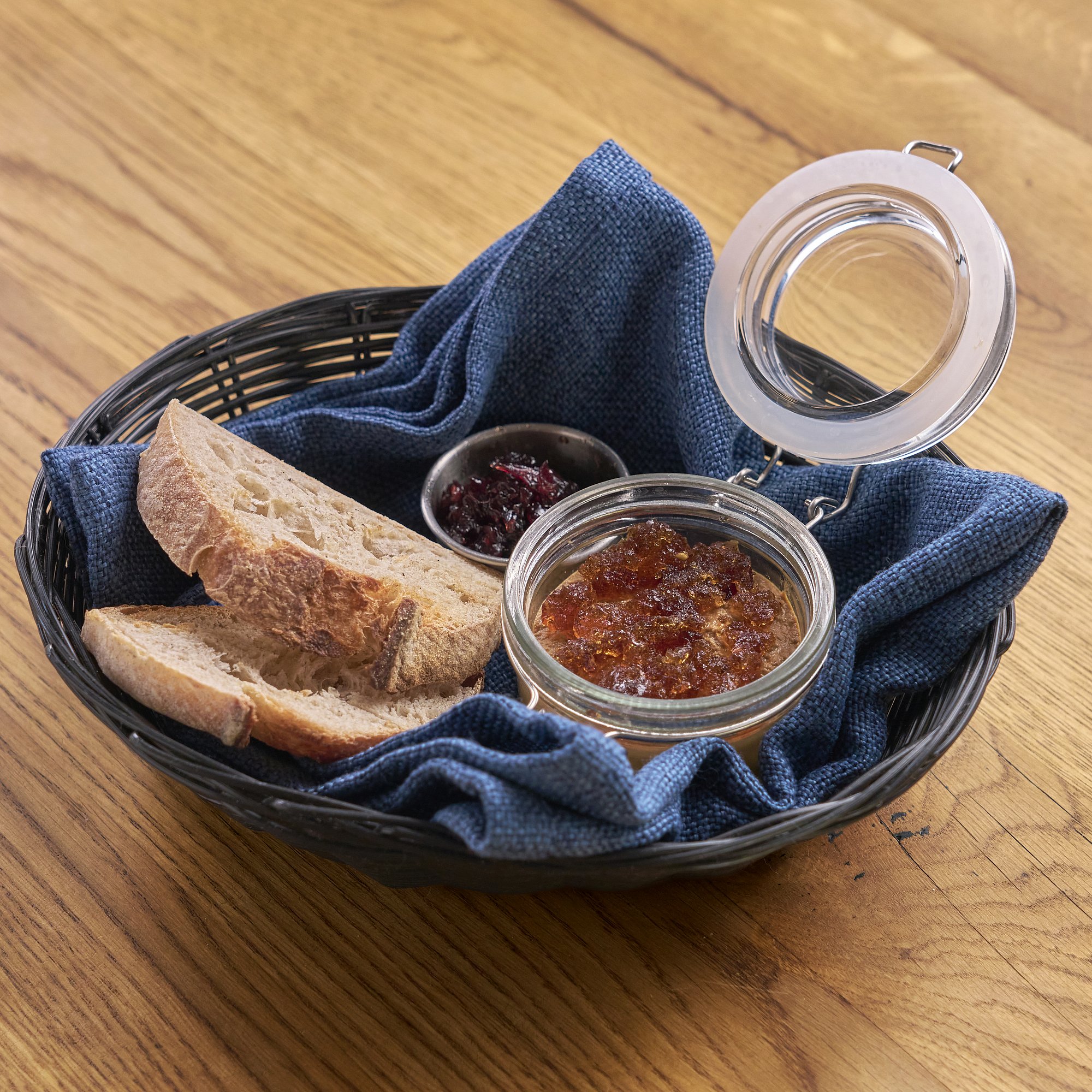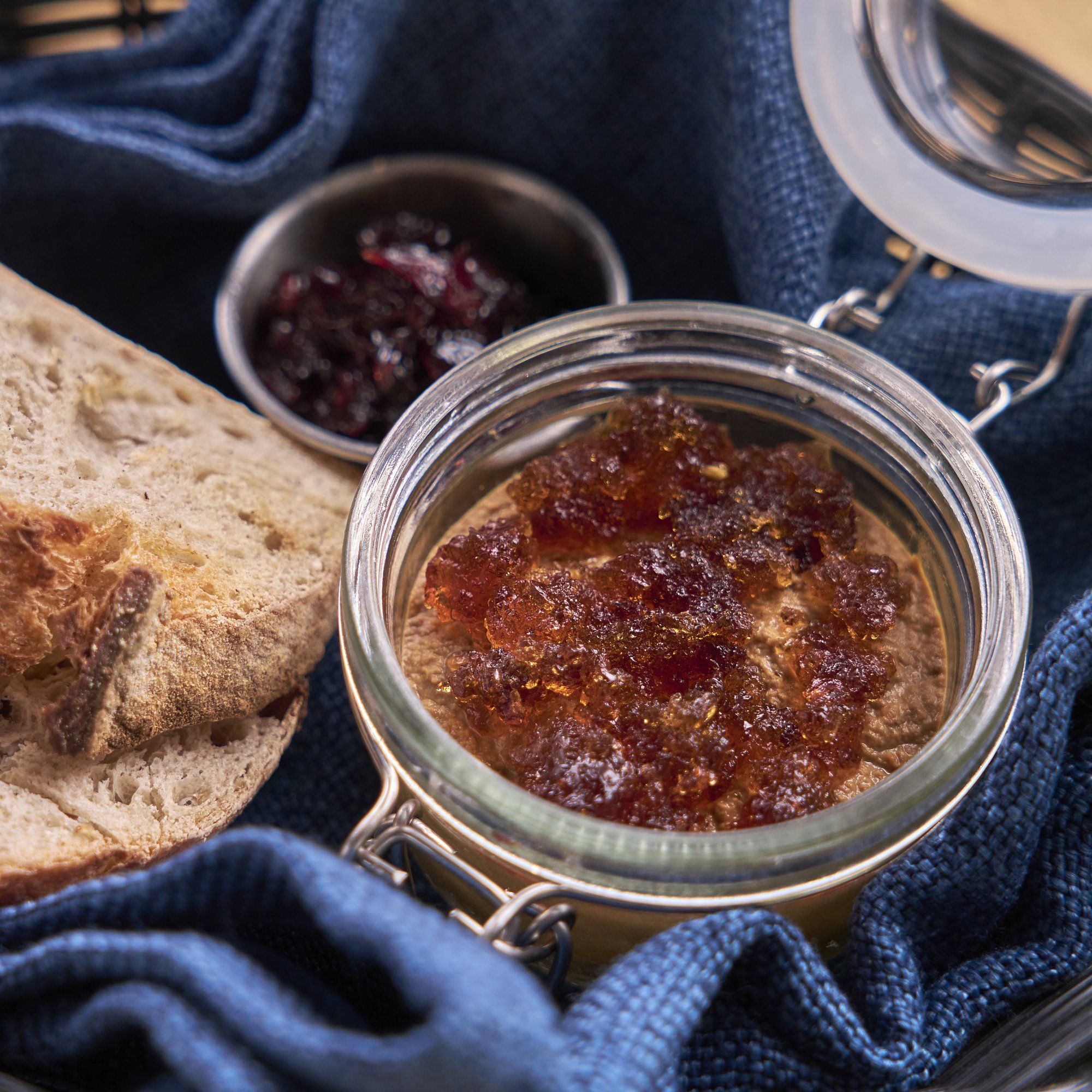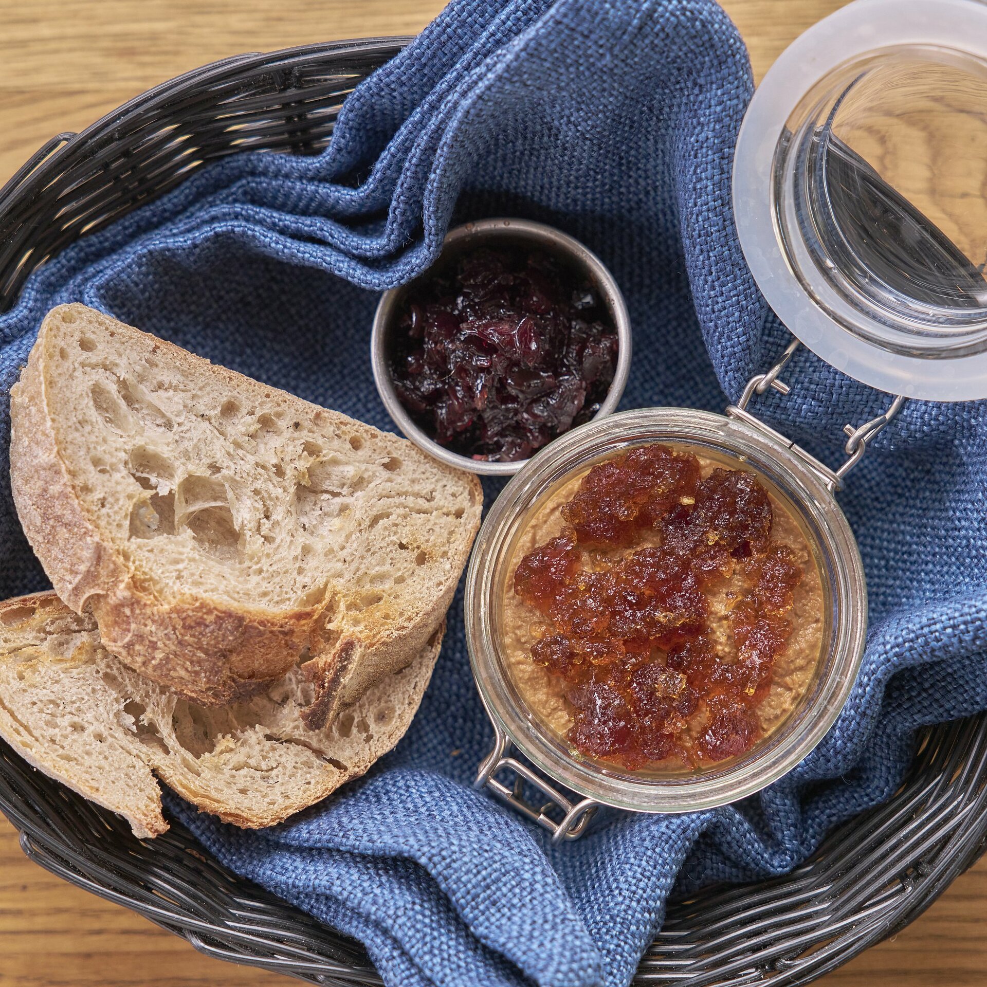 Воздушный, тающий паштет из печени, сердца и легкого поросенка. Готовится на сливках с травами и мускатным орехом для идеальной кремовой текстуры. В комплекте — пикантный конфитюр из красного лука на квасе, который подчеркивает вкус паштета. Идеален с хрустящим хлебом.