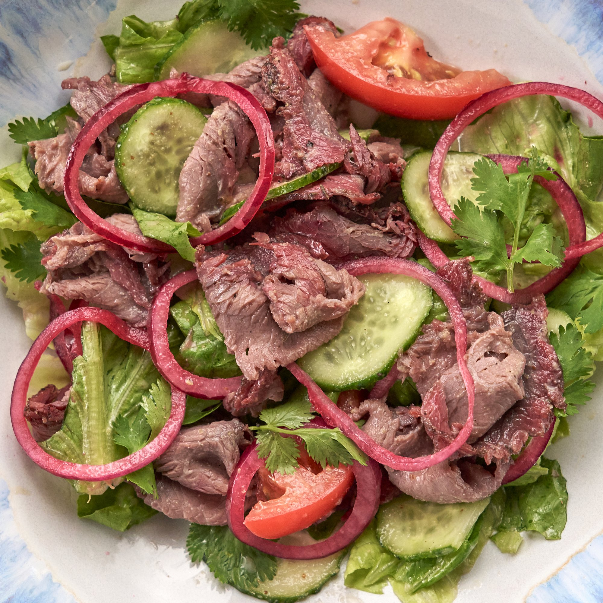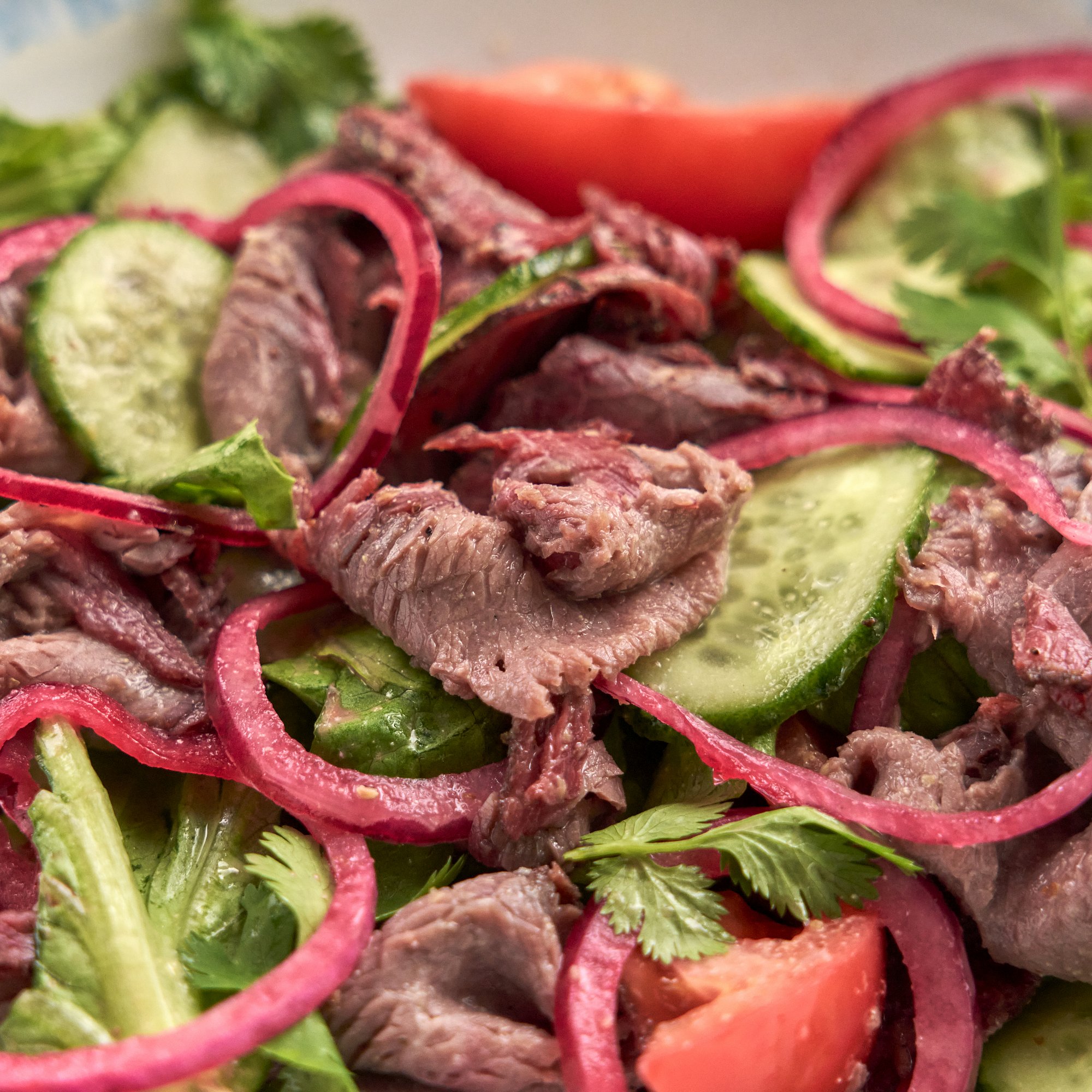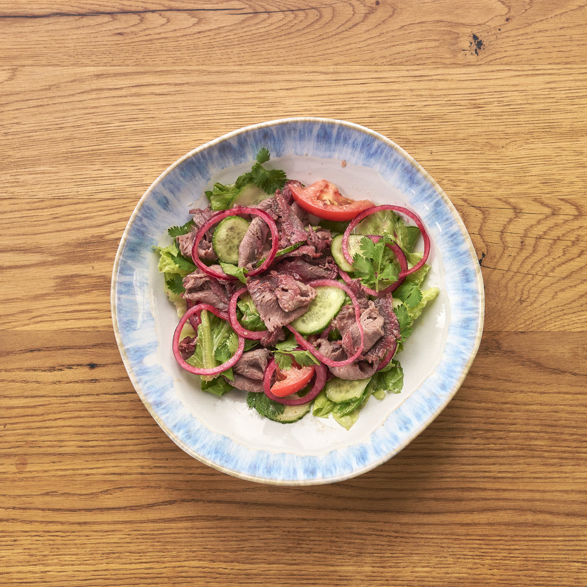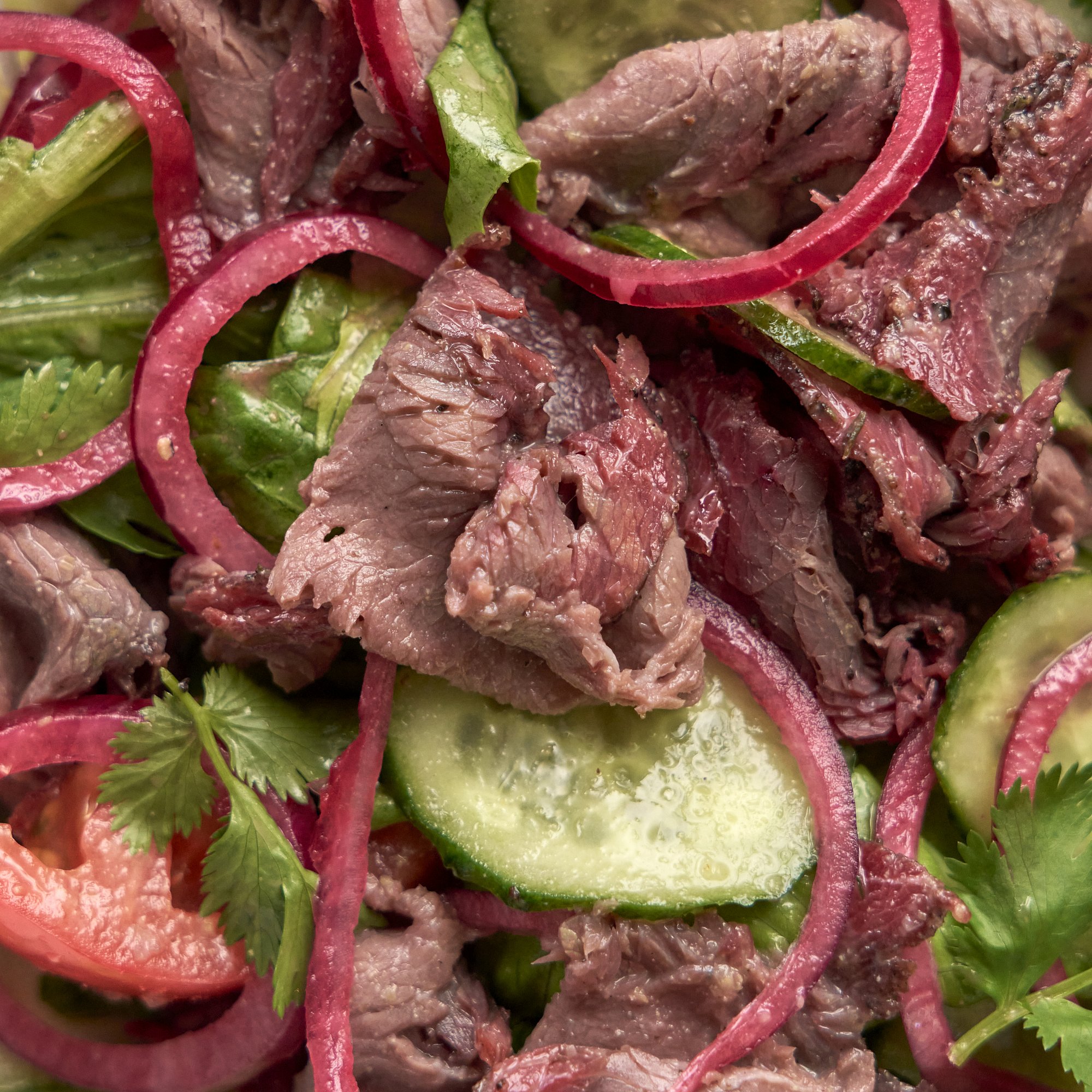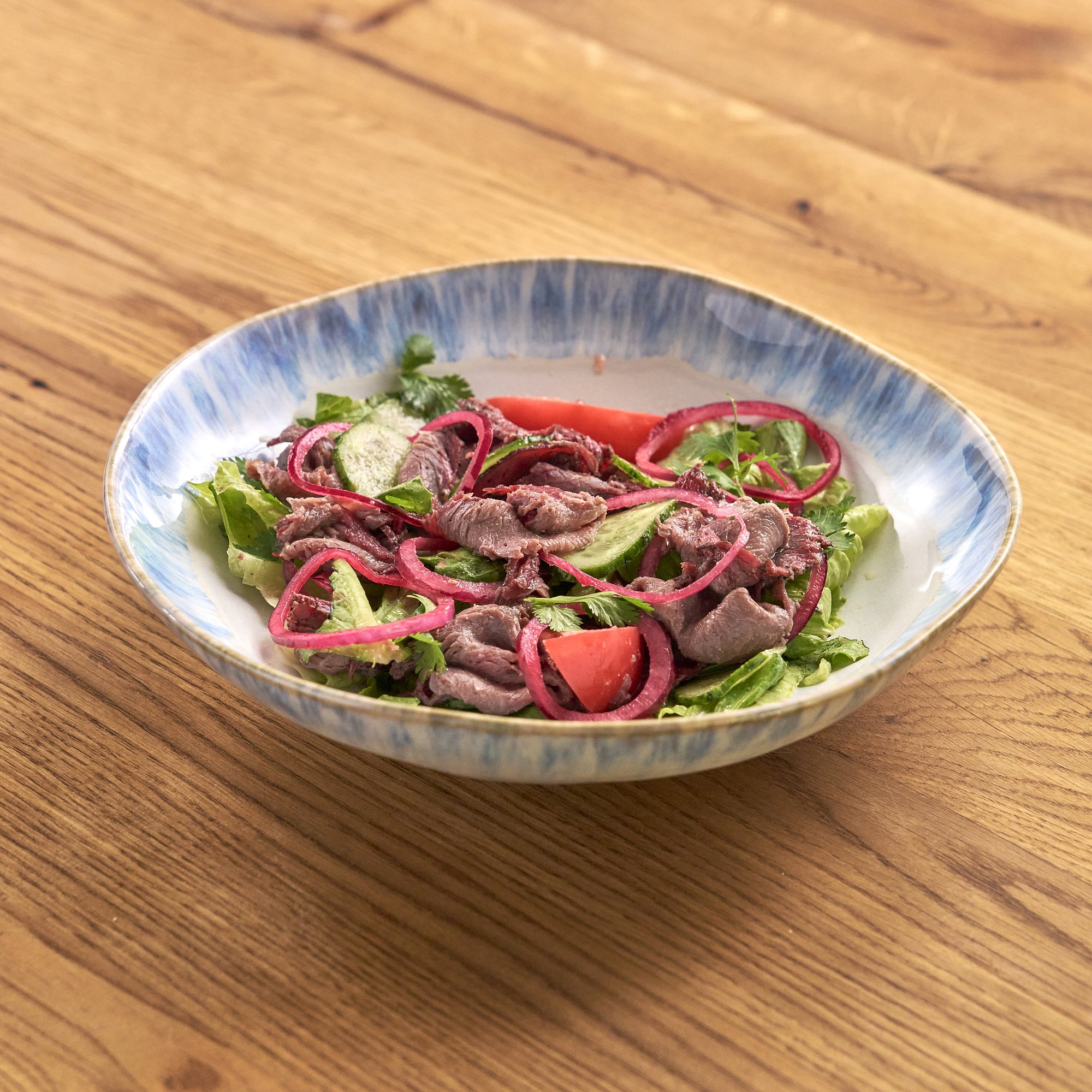 Нежнейший копченый ростбиф, хрустящий салат Романо и свежие овощи создают основу салата. Их объединяет изысканная соево-медовая заправка с нотками горчицы, которая подчеркивает вкус мяса, а пикантные нотки красного лука и свежесть кинзы довершают эту гармонию.
