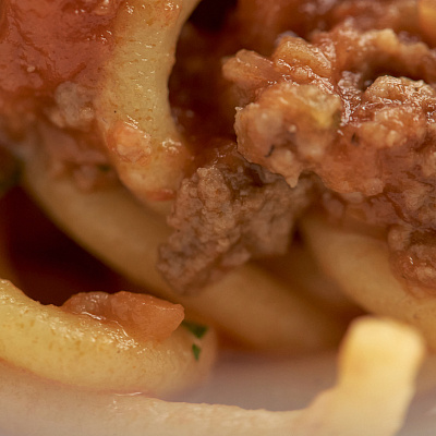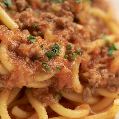 Соус болоньезе: морковь, стебель сельдерея и репчатый лук, обжаренные на сливочном масле до золотистого цвета, фарш из вырезки лопатки с добавлением белого вина, после добавляются томаты в собственном соку, и всё слегка протушивается и доводится до вкуса. В соус добавляются спагетти fresca, готовое блюдо посыпается пармезаном.